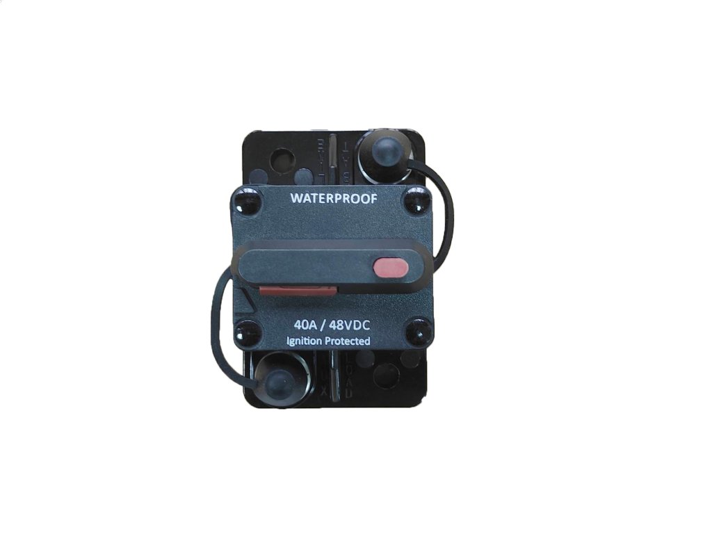Povrchový istič 40A pre 12/24/36V, vodotesný (IP67) s manuálnym resetom, matice, podložky a skrutky z nehrdzavejúcej ocele.