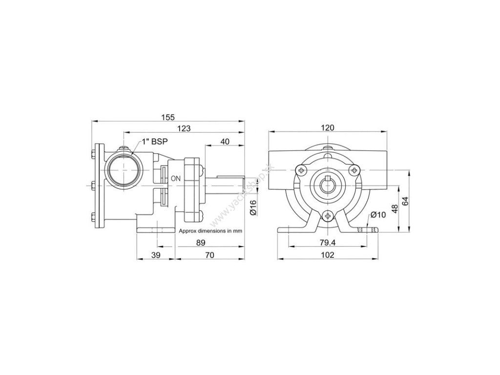 Samonasávacie bronzové čerpadlo na chladiacu vodu Prietok: Neoprénové obežné koleso je súčasťou dodávkyPripojenia: Nominálne 80 litrov/min pri 1 500 otáčkach za minútu 25 mm (1") vnútorný závit BSPDodatočné parametre