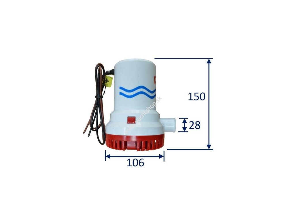 Čerpadlo s kapacitou 1 500 galónov za hodinu (5680 L/hod). Napájanie 12 V a malo by byť chránené poistkou 15 A. Výstupný otvor pre toto útorové čerpadlo je 28 mm. Na zapojenie pomocou ručného spínača alebo pomocou plavákového spínača.