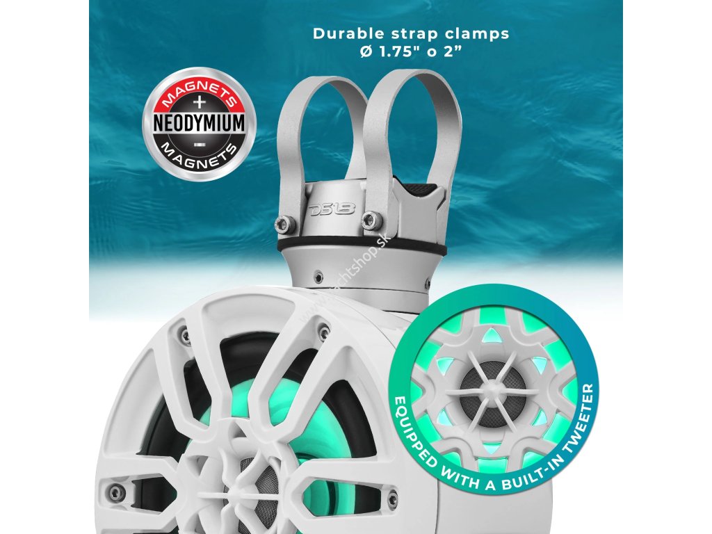 Inštalácia je neuveriteľne jednoduchá vďaka robustným popruhovým svorkám – umožňujú bezpečné upevnenie k rúrkam s priemerom 45 – 50 mm a ponúkajú maximálnu stabilitu aj v rozbúrenom mori . Ďalším lákadlom je integrované RGB LED osvetlenie , ktoré štýlovo zvýrazňuje nielen reproduktor , ale aj výrazné logo DS18 , čím vytvára pôsobivú atmosféru na palube .