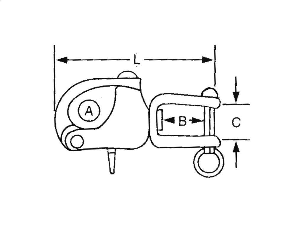 Svorka s otočnou vidlicou z nehrdzavejúcej ocele AISI 316, s voľne otočnou čeľusťou, typ spinnaker. Veľkosť: D 65 mm. A 13 mm. B 10 mm. C 10 mm.Dodatočné parametre