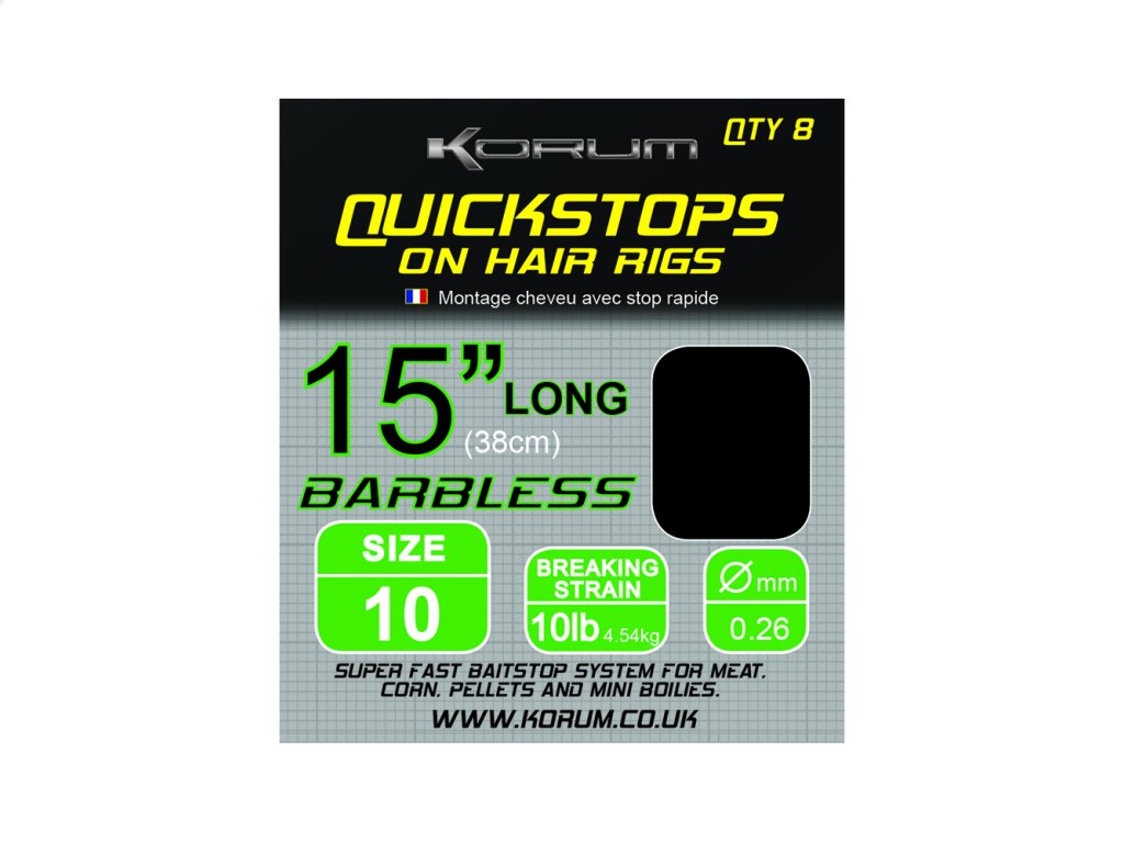 Vlasové nadväzce Korum s rýchloupínacími zarážkami vám umožnia rýchlo meniť nástrahu bez toho, aby ste si museli viazať vlastné háčiky! Tieto háčiky sú k dispozícii v dĺžkach 4 a 15 a s háčikmi veľkosti 10-16 a s ostňami a bez ostňov.Dodatočné parametre