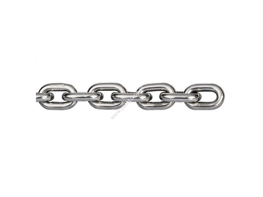 Reťaz kalibrovaná podľa DIN766 z nehrdzavejúcej ocele AISI 316L pre kotvové navijaky. Kontrolovaná výroba. Trieda G40 s vysokou medzou zaťaženia.