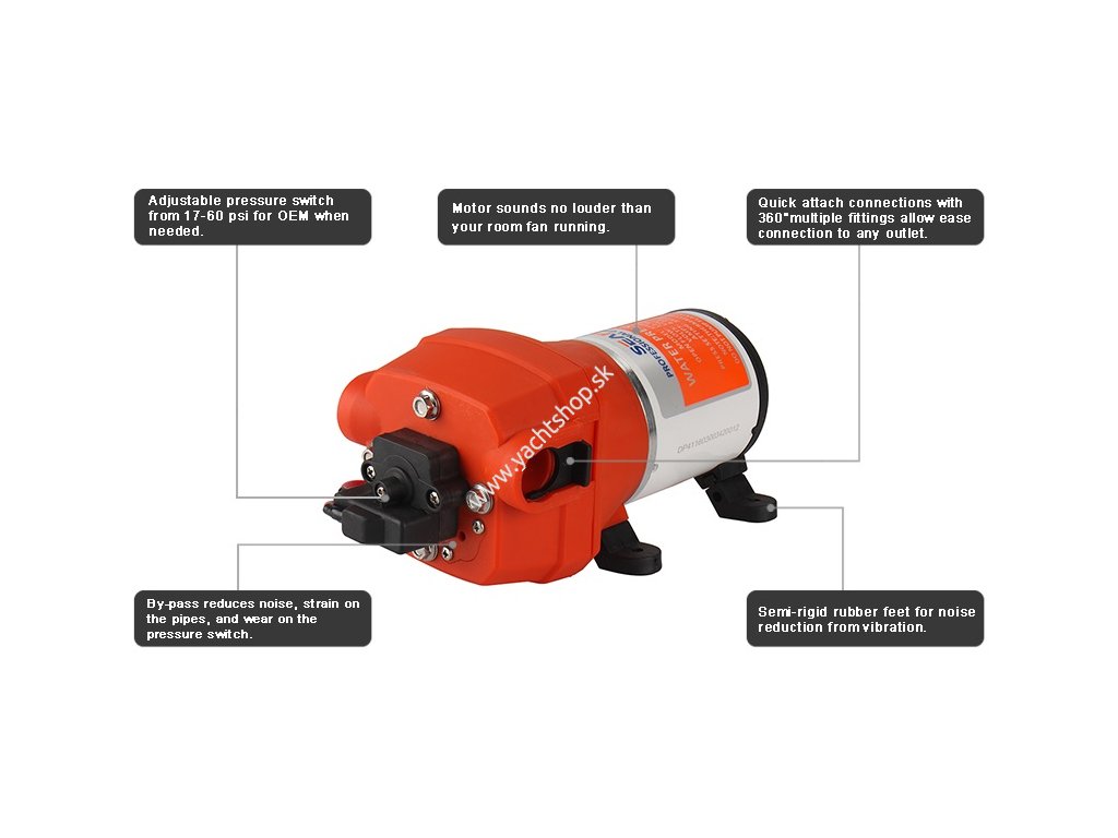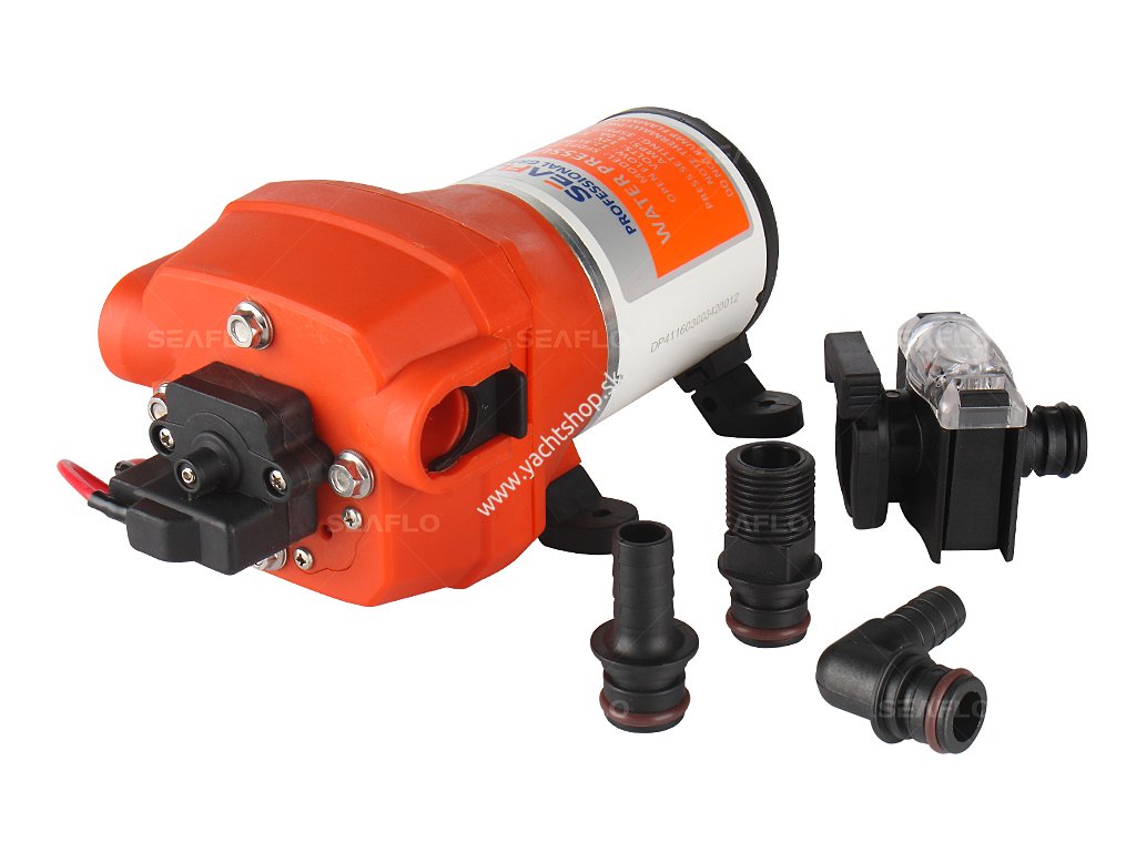 SEAFLO sladkovodné tlakové čerpadlo primárne určené pre umývadlá a sprchy, pre lode, karavány. Použitie od 1 do 5 zásuviek podľa modelu.