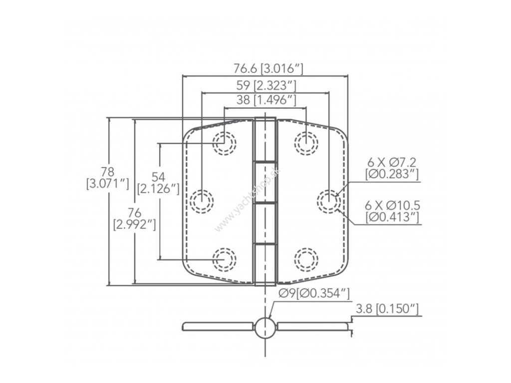 Záves s krytom AISI 316. Upevňovacie skrutky sa dajú skryť bi-adhezívnou páskou 3M VHB umiestnenou na kryte s veľkým estetickým efektom. Rozmery mm. 74 x 75.Dodatočné parametre