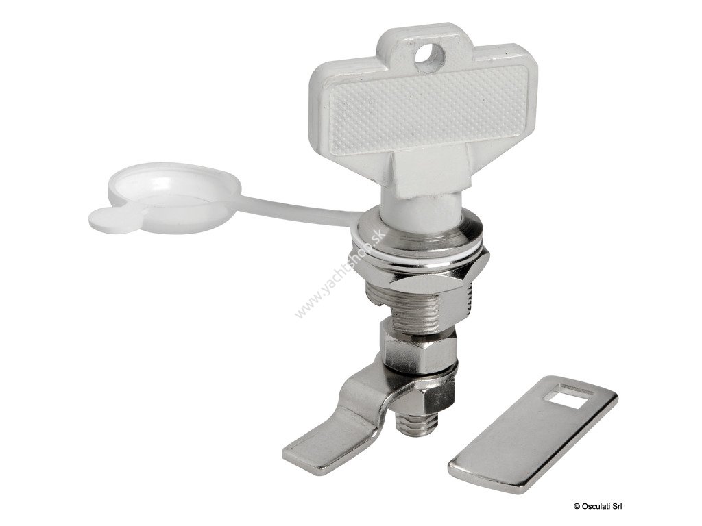 Chrómovaná mosadz, vybavená vodotesným ochranným uzáverom, kľúčom a dvojitou pákou. otáčanie o 90° s antivibračnou vnútornou pružinou.Dodatočné parametre