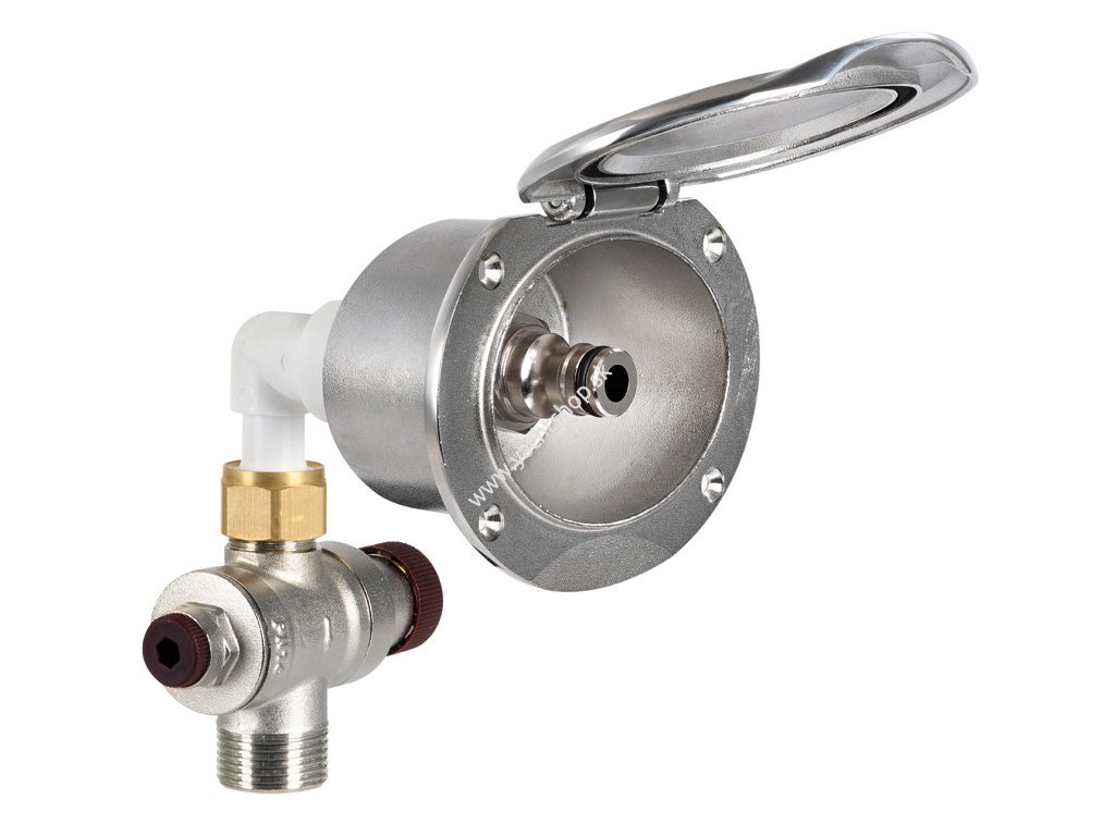 Tento inovatívny systém stabilne znižuje tlak na 3 bary, čím chráni potrubie pred možným poškodením. Kompaktné zariadenie vybavené nastaviteľným regulátorom tlaku a orientovateľným mosadzným spätným ventilom zabezpečuje bezpečný a konštantný prietok. Hadica na prístavnú vodu sa dá jednoducho pripojiť pomocou záhradníckej karabíny (kód 36.189.02). Výstupný závit je 3/4" BSP. Aj keď systém zostane pripojený k doku, tlak sa udržiava stabilný na úrovni 3 bar bez ohľadu na tlak v prívodnej sieti.Dodatočné parametre