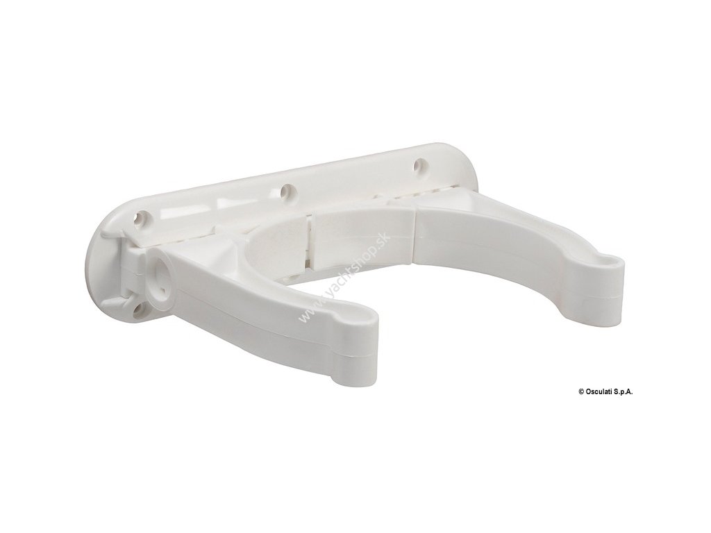 Nástenný držiak na potápačské fľaše so stlačeným vzduchom, univerzálna veľkosť; vybavený nylonovou posuvnou základňou na montáž na stenu, na ktorú sa držiak montuje; nastaviteľná šírka a možnosť sklopenia; vyrobený z bieleho polypropylénu, súprava obsahuje 2 základne + 2 držiaky.Dodatočné parametre