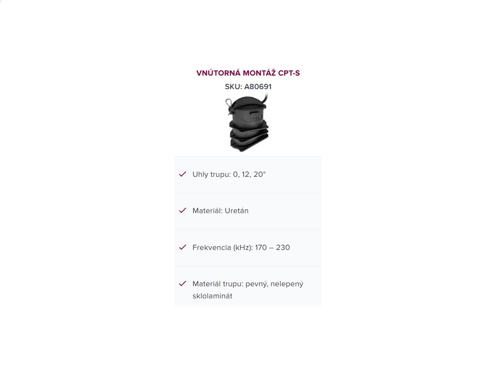 Vnútorný hĺbkový prevodník CPT-S je ľahko inštalovateľné riešenie pre trupy s jedným plášťom zo sklolaminátu (nie sendvičové). Vnútorný prevodník CPT-S je ideálny na rekreačné použitie na plachetniciach a malých motorových člnoch a pracuje s technológiou CHIRP na frekvencii 200 kHz. Vnútorný prevodník CPT-S prenáša sonarové signály cez trup plavidla, čím zjednodušuje inštaláciu a poskytuje spoľahlivé a vysokorýchlostné zaznamenávanie hĺbky. Inovatívny dizajn trubicového puzdra umožňuje jednoduchú inštaláciu vnútorného prevodníka CPT-S do trupov s uhlom kýlu od 0 do 25 stupňov.