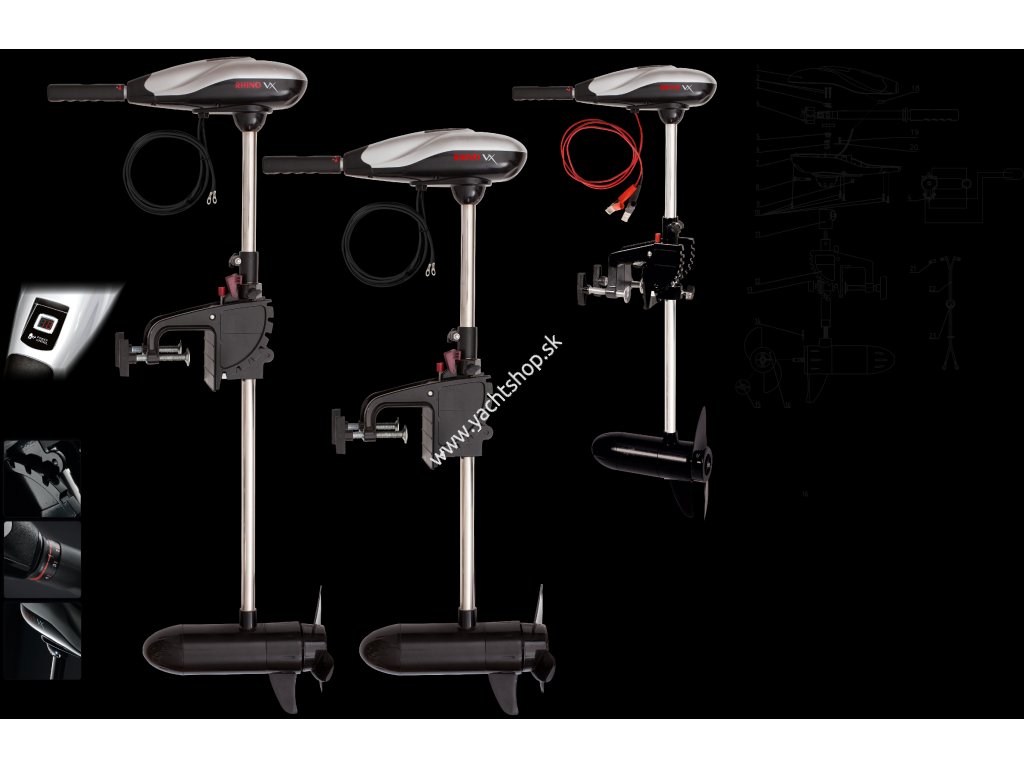Silný, silnejší, lodný elektromotor Rhino VX. Jeden z najsilnejších závesných lodných elektromotorov na trhu. Rhino VX sa vyznačuje nízkou spotrebou energie, čo umožňuje dlhší manipulačný čas. Motor sa riadi a ovláda rukoväťou a má 5 rýchlostí vpred a 2 vzad. Motor môže byť jednoducho vyklopený z vody stlačením tlačidla. Hĺbka ponoru vrtule a tuhosť riadenia sú plynule nastaviteľné. Elektromotor Rhino VX poskytuje jednoduché, komfortné a bezpečné ovládanie. Vhodné pre všetky bežné a rekreačné plavidlá.