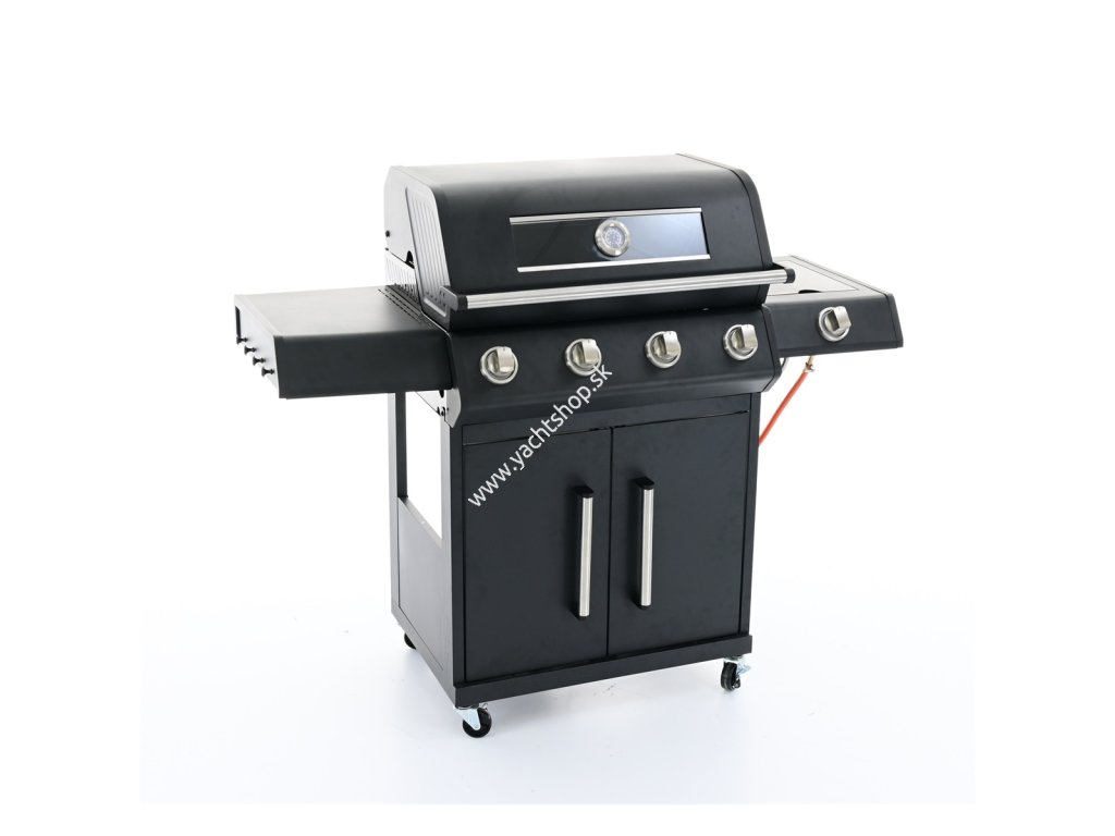 luxusný plynový gril s robustnou konštrukciou a elegantným dizajnom sa skvele hodí ako pre grilovanie v úzkom rodinnom kruhu, tak aj pre väčšie párty a rodinné oslavy skvelá výbava pre pohodlné aj zdravé grilovanie štyri hlavné, veľmi výkonné ploché horáky z nerezu majú horný kryt aj odtok odkvapkávajúci tuk, vďaka čomu je zamedzené prepaľovaniu tuku a tvorbe škodlivých látok užitočný bočný varič na prípravu horúcich nápojov, omáčok alebo príloh možno ľahko zakryť vyklápacím krytom a môže slúžiť ako druhý odkladací stolík ľahké zapaľovanie horákov pomocou elektrického piezo zapaľovania integrovanom v každom z piatich gombíkov.