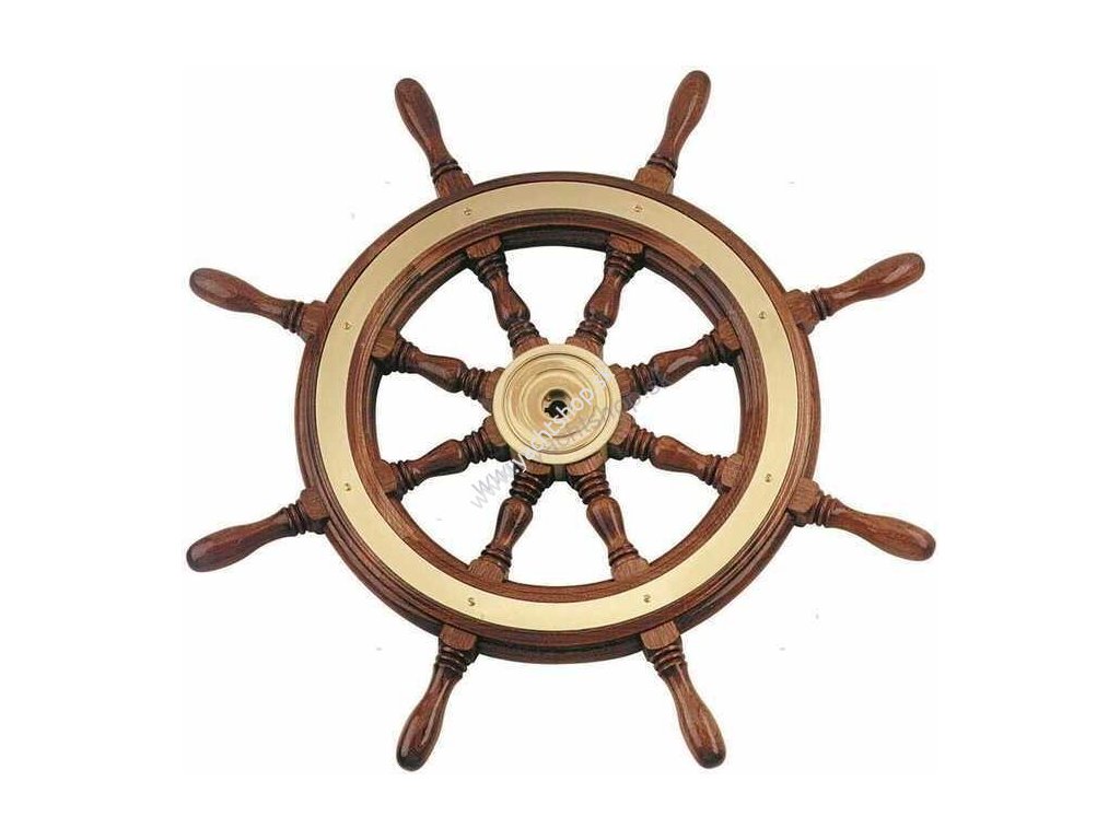 Náboj a ráfik z mahagónu kormidelnícke koleso z leštenej mosadze.