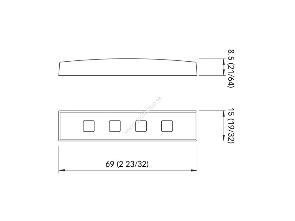 Obdĺžnikové hranaté zdvorilostné svetlo vyrobené z chrómovaného plastu a technopolyméru stabilizovaného UV žiarením, s difúzorom, ktorý premieta svetlo dopredu cez malé očká. IP 65 so 4 LED diódami, teplé biele alebo modré svetlo. Polarita je opačná.Dodatočné parametre
