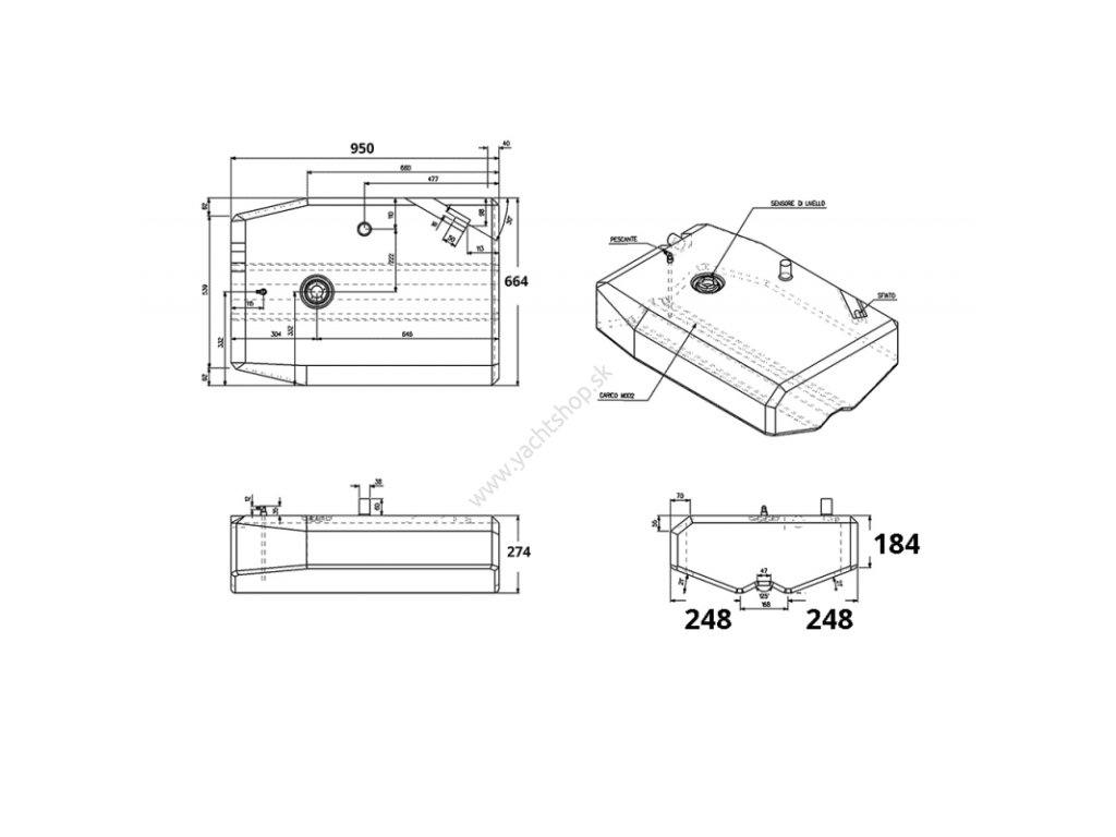 Pevné palivové nádrže vyrobené z polyetylénu sú certifikované CE v súlade so smernicou 94/25/ES podľa 10088. Tvoria trup s obráteným lichobežníkovým prierezom, ktorý kopíruje profil trupu, aby sa maximalizoval priestor pre zálievku. vložky na nastupovanie, odvzdušnenie Ø mm. 16, plavák a vratný ventil Ø mm 12. Každá nádrž je individuálne testovaná. Farebne neutrálne.Dodatočné parametre