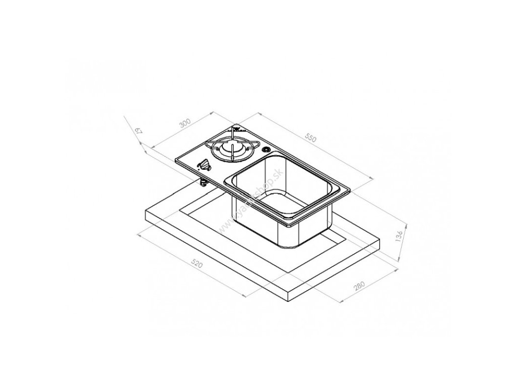 Varná doska s plynovým drezom s manuálnym zapaľovaním, z 8 mm hrubého čierneho tvrdeného skla. Vstavaná inštalácia. S bezpečnostným termočlánkom. Odtok nie je súčasťou dodávky. S otvorom pre držiak na hrniec. Certifikát CE.Dodatočné parametre