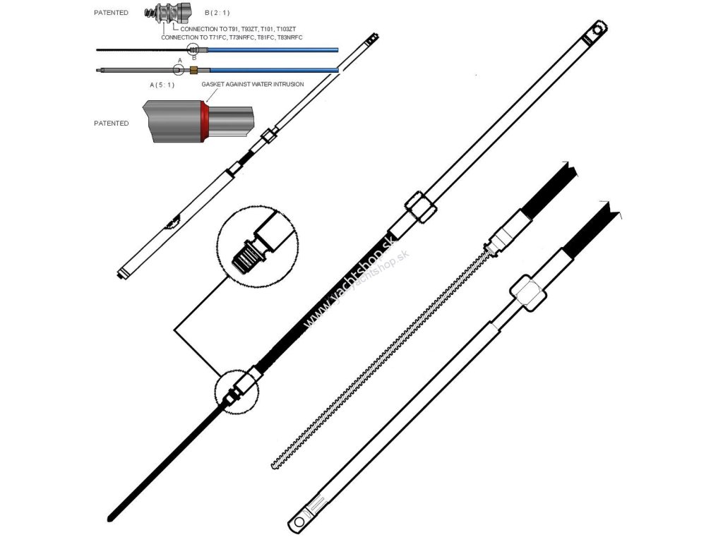 Ultraflex kábel M58 s nerezovými kábelovými ukončeniami. Minimálny polomer ohybu 200 mm.