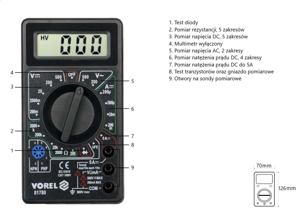Univerzálny merací prístroj 81780 s manuálnym rozsahom umožňuje vykonávať základné elektrické merania.