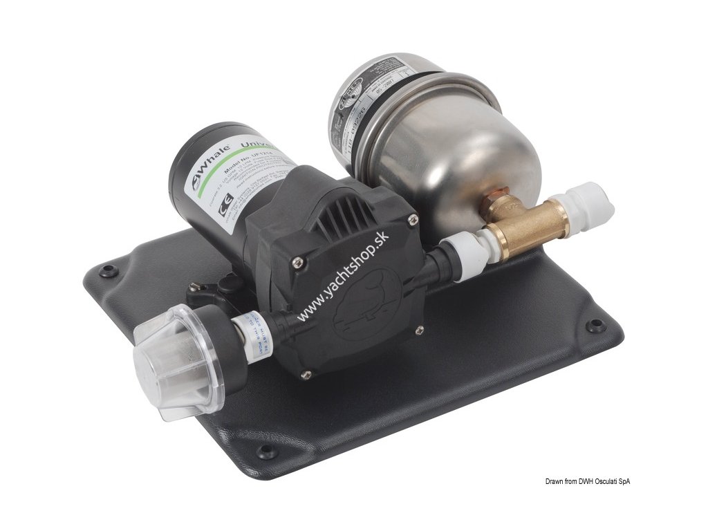 Systém obsahuje jedno 4-membránové čerpadlo na čerstvú vodu vybavené 1litrovou akumulačnou nádržou z nehrdzavejúcej ocele a vstupným sitkom. základňa s rozmermi 280 x 260 mm je vyrobená z odolného ABS. Montáž pomocou 4 priechodiek tlmiacich vibrácie, 15 mm vstupné a výstupné rýchlospojky.Dodatočné parametre