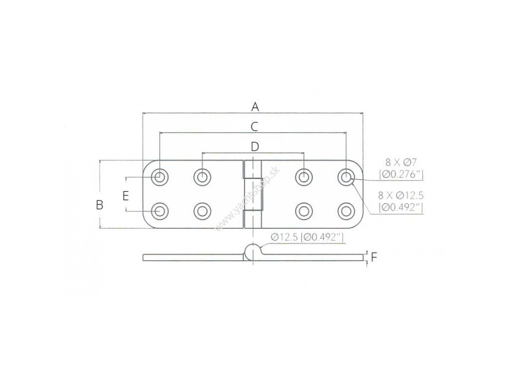 Zrkadlovo leštené závesy z nehrdzavejúcej ocele AISI 316. Veľmi pevné. Vhodné pre ťažké poklopy a vrcholy. Hrúbka mm. 4,8. Veľkosť: A 165 mm. B 51 mm. C 140 mm. D 76,2 mm. E 25,4 mm. F 4,8 mm.Dodatočné parametre