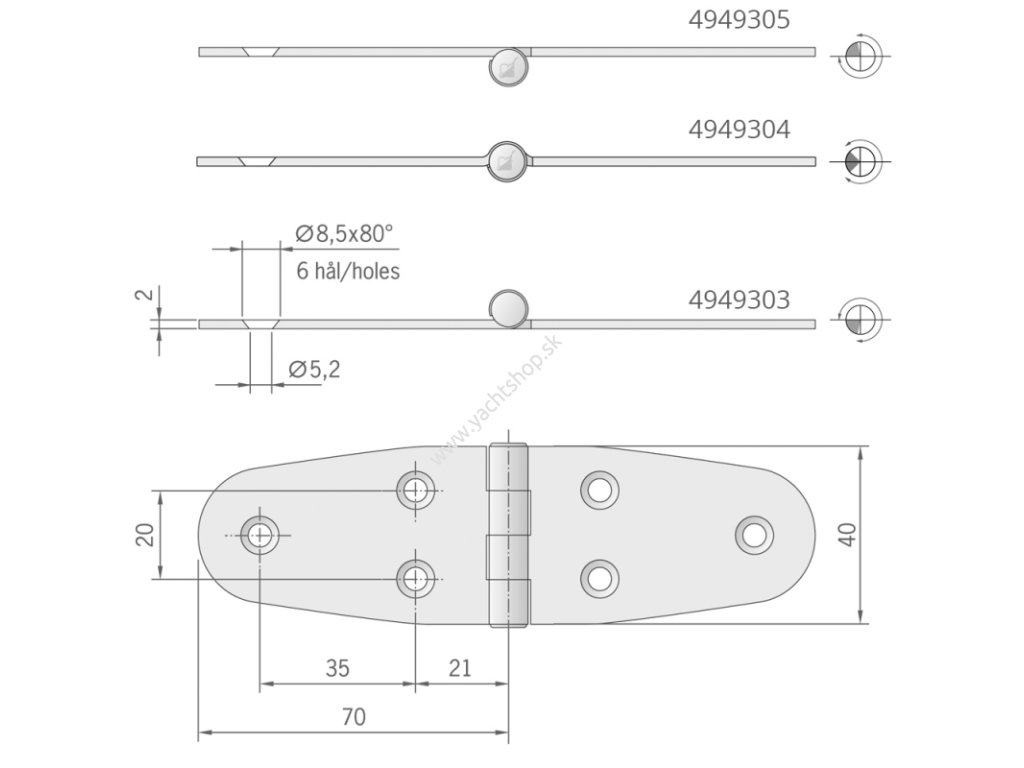 Zrkadlovo leštené závesy z nehrdzavejúcej ocele AISI 316. Hrúbka mm. 2, Ø čapu mm. 9.Dodatočné parametre